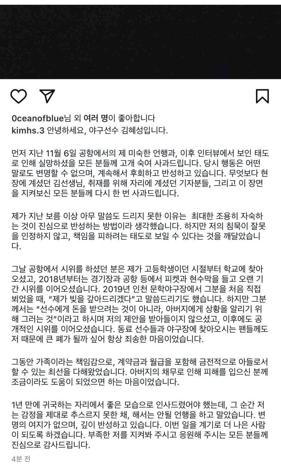 2025.11.22 김혜성 SNS 공식 사과문 발표