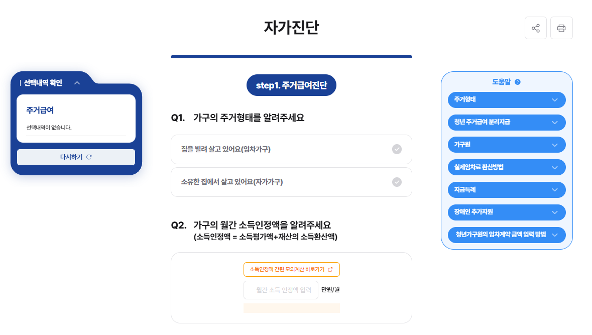 - 가구원 수, 소득·재산, 임대 여부 입력