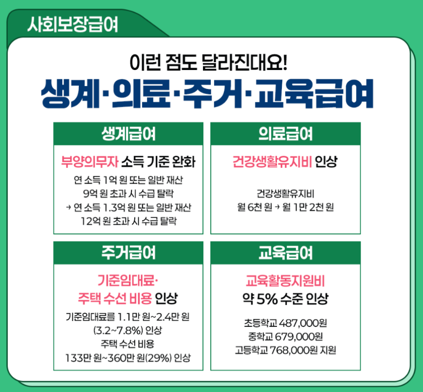 - 2025년 변화: 부양의무자 기준 완전 폐지, 지원금 최대 29% 인상