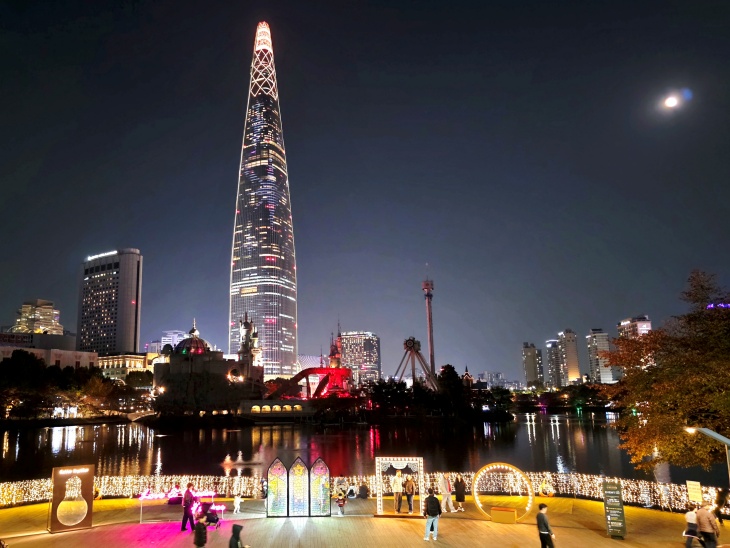 마켓과 놀이기구로 살짝 피곤해졌다면 석촌호수 루미나리에 산책으로 마무리하세요.
