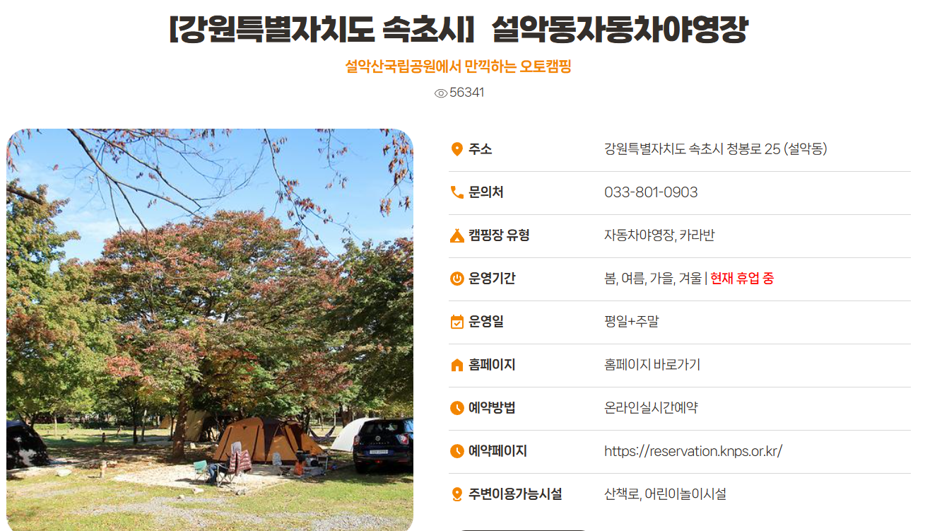 아쉽지만 설악동 야영장은 내부 공사중으로 9월말까지 운영 중단중이라고 한다