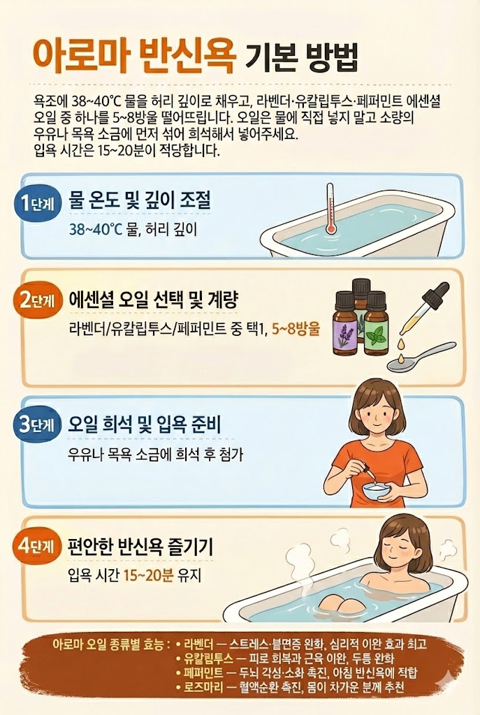 욕조에 38~40°C 물을 허리 깊이로 채우고, 라벤더·유칼립투스·페퍼민트 에센셜 오일 중 하나를 5~8방울 떨어뜨립니다. 오일은 물에 직접 넣지 말고 소량의 우유나 목욕 소금에 먼저 섞어 희석해서 넣어주세요. 입욕 시간은 15~20분이 적당합니다.