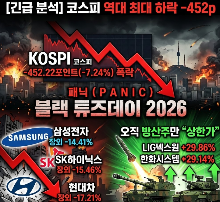 #코스피역대최대하락 #코스피폭락 #삼성전자주가 #SK하이닉스 #현대차주가 #방산주 #LIG넥스원 #한화에어로스페이스 #호르무즈봉쇄 #국제유가전망 #나스닥선물 #코스피전망2026 #주식투자대응전략 #외국인매도 #이란전쟁수혜주