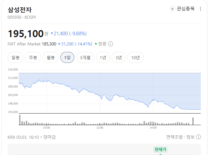 | 삼성전자 | 195,100원 (-9.88%) | 185,300원 | -14.41% |