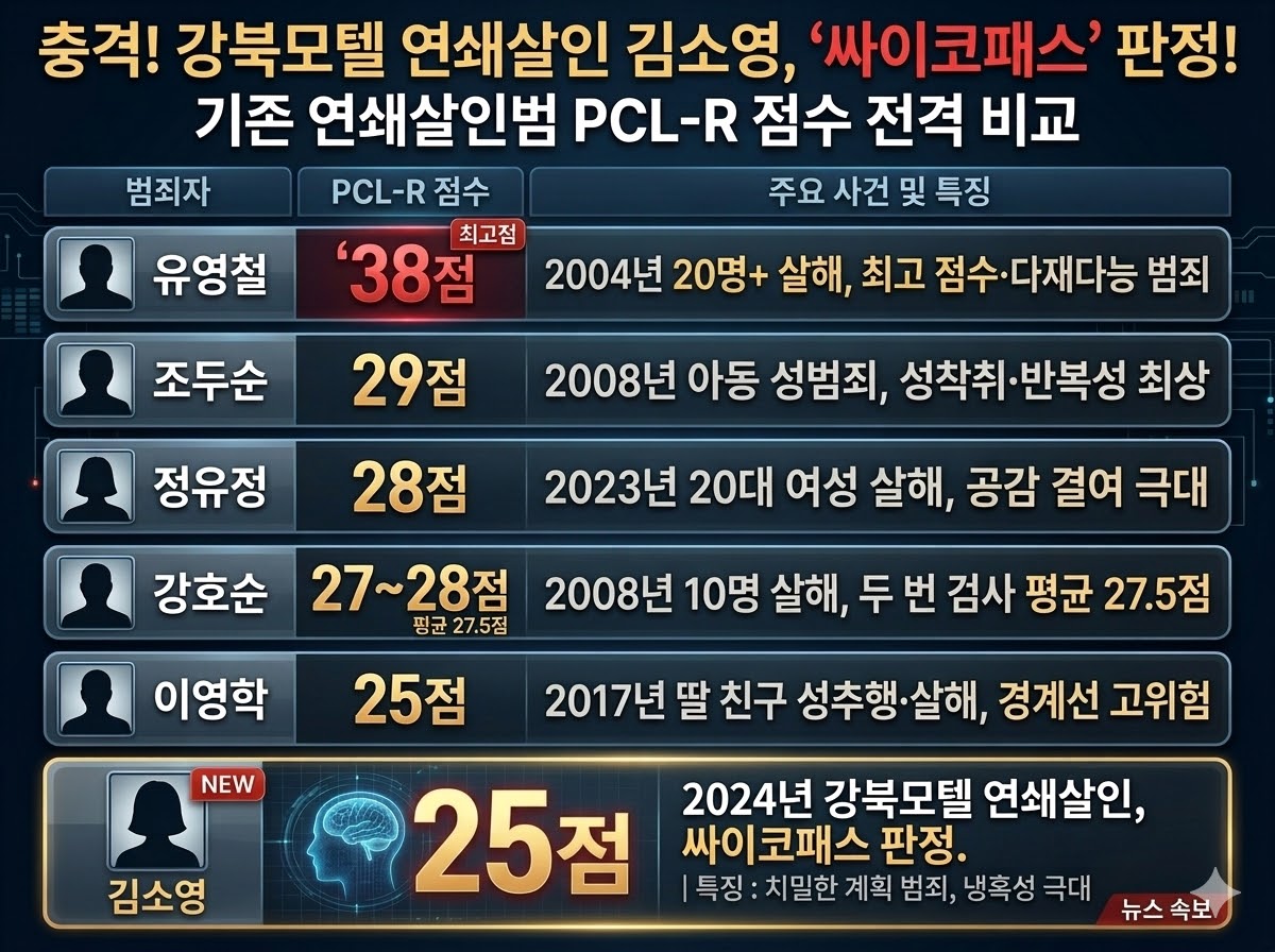 2026년 3월 9일 오후, 서울북부지검은 신상정보공개심의위원회 심의를 거쳐 강북 모텔 연쇄살인 사건 피의자 김소영(20세)의 이름·나이·머그샷을 공식 공개했습니다. 최근 강북 모텔 살인 신상공개, 김소영 사이코패스, 강북 모텔 살인 추가 피해자 검색량이 급증하고 있습니다.
