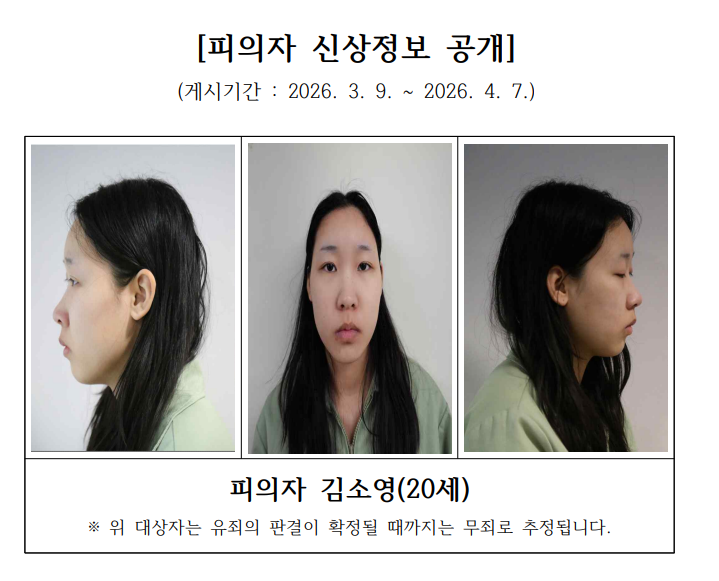① 신상공개 — 서울북부지검, 오늘 오후 20세 김소영 이름·머그샷 공개 (30일간)