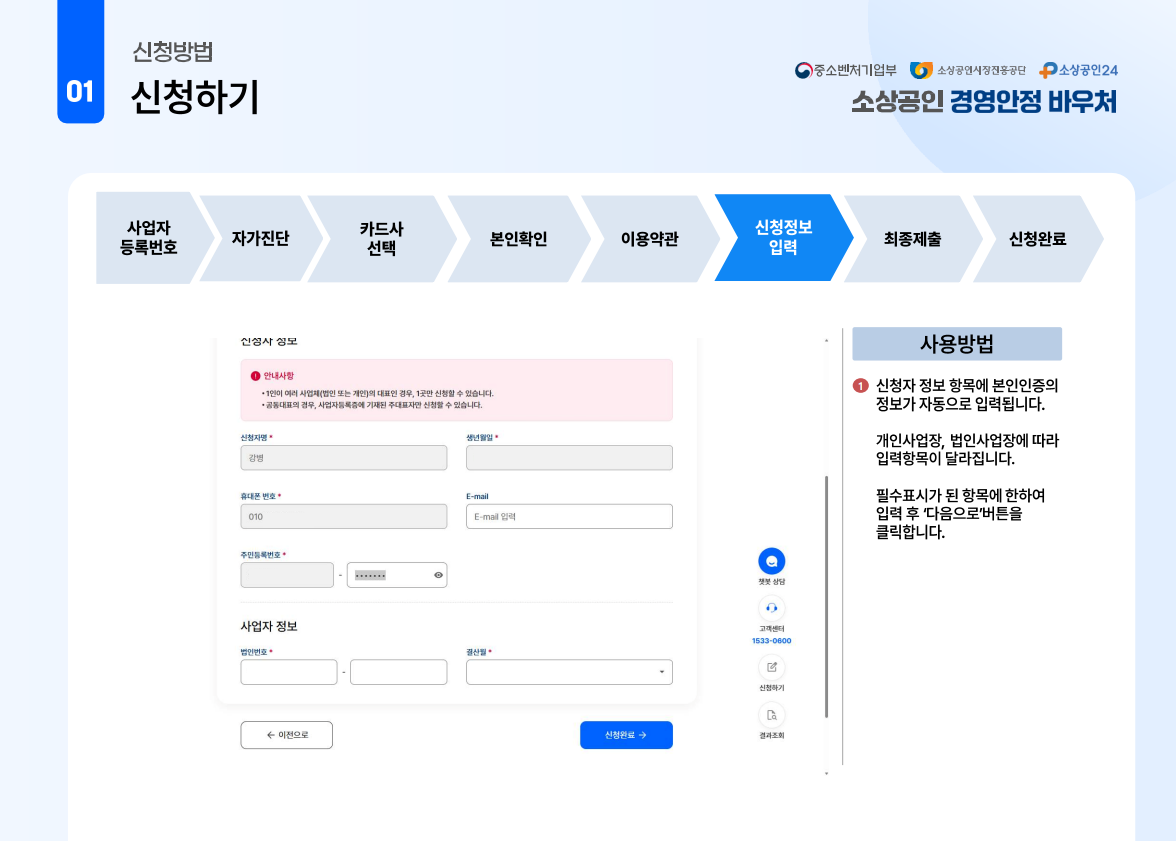 • 추가 증빙: 재도전 자금 신청 시 폐업신고서, 채무조정 확인서 등