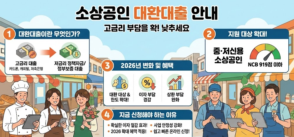 소상공인 대환대출은 고금리 카드론·캐피탈·저축은행 대출을 저금리 정책자금 또는 정부보증 대출로 갈아타는 제도입니다. 2026년에는 대환 대상과 한도가 확대되어 중·저신용 소상공인(NCB 919점 이하)도 적극 활용할 수 있습니다.