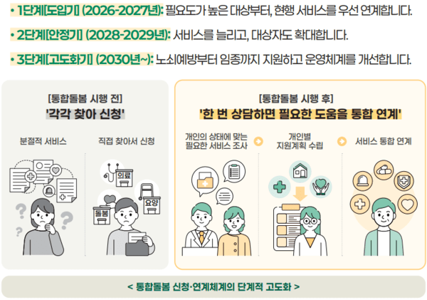 | 시행 초기 자동 서비스 연계 기대 | 2026~2027년 1단계에서는 통합돌봄 신청 후 일부 개별 서비스는 별도 신청 필요. 자동 연계는 2단계(2028년~)부터 |