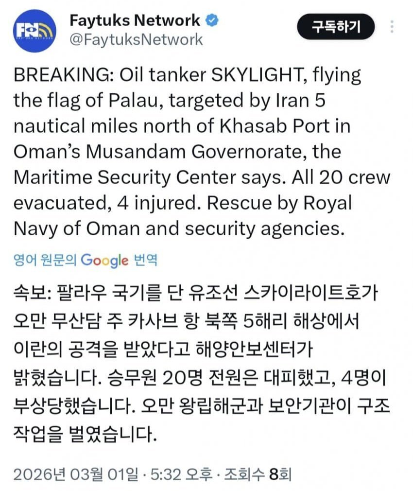 • 유조선 3척 피격 — 팔라우 국적 스카이라이트 포함, UKMTO 공식 발표