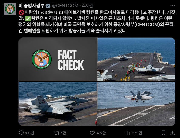 • 미 항모 링컨함 피격 — IRGC 주장 → CENTCOM "피해 없음" 공식 반박