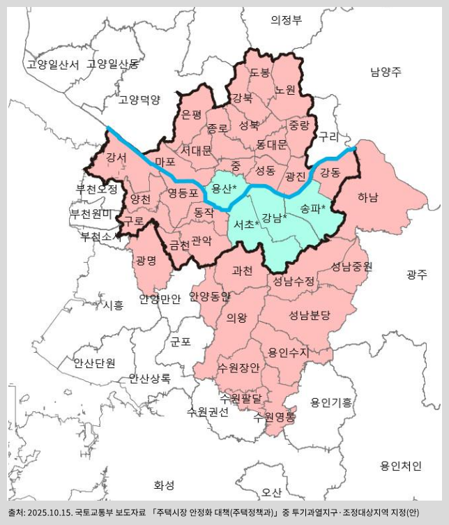 ✅ 서울 전역 + 경기 남부 12개 시 조정대상지역·투기과열지구·토허제 동시 지정 (10.20 시행)