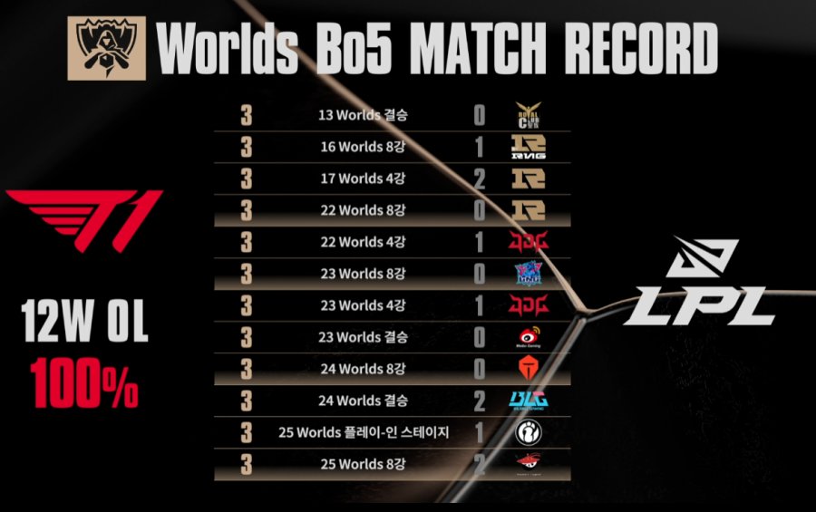 T1은 월즈 다전제(Bo5) 기준, LPL팀 상대로 12전 12승이라는 경이로운 기록을 보유하고 있습니다. 중국팀 상대로 단 한 번도 시리즈를 내준 적이 없는 '중국 킬러'입니다.