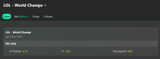 vs T1: T1은 중국전 12연승 무패의 강팀이지만, KT의 후반력이 변수입니다. 배당률 T1 2.20 / KT 2.10으로 박빙입니다.
