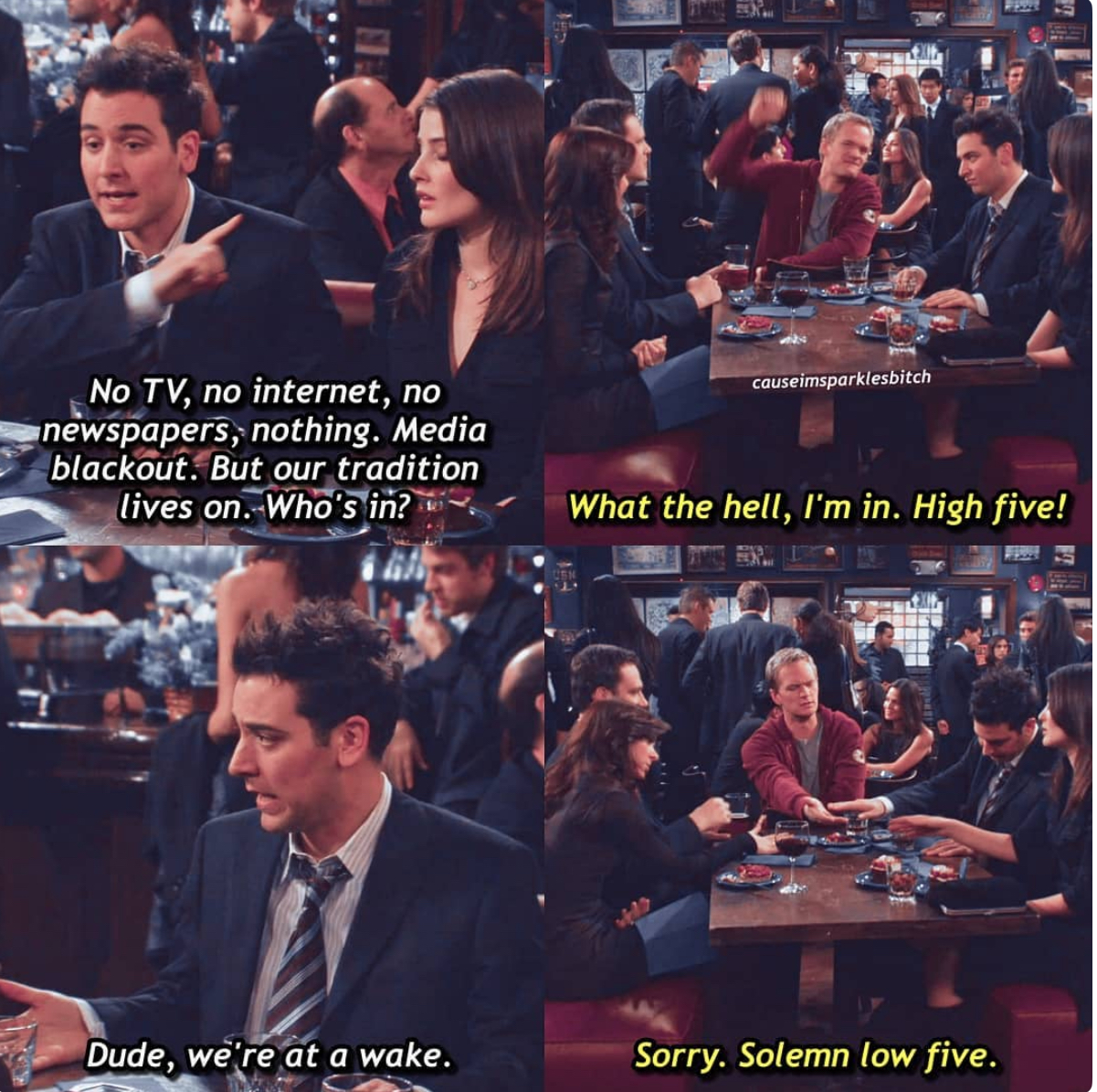 • 대사 근거: “Suit up”, “Challenge accepted” 등 HIMYM 반복 대사 / “No TV… Media blackout”, “Solemn low five” 해당 회차 장면 기반(자막/스크립트 사이트 다수 참조).